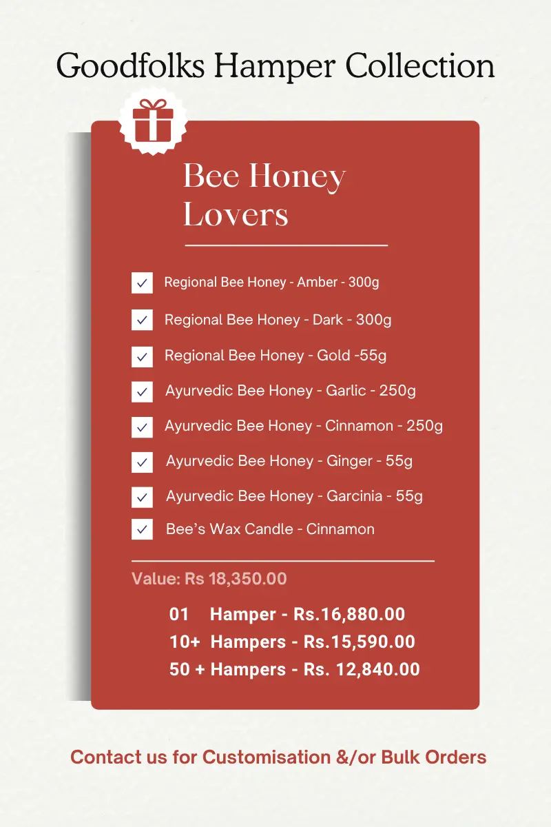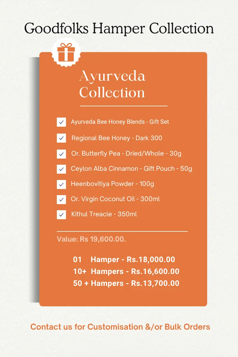 | Honey Lovers | 11,500 | 3 Ayurvedic honeys + pollen + propolis | Nature’s golden cure | Healing & luxury |